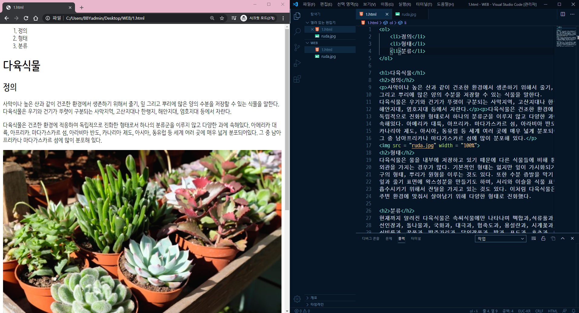 웹 페이지에서 목차(목록)를 쓸 때 사용하는 태그 리스트 <li>를 사용해봅시다. 아까 사용했던 <br>태그를 지우고 목차의 숫자 앞에 <li>, 현재 <br>태그의 위치에 닫는 태그 </li>를 써줍니다.