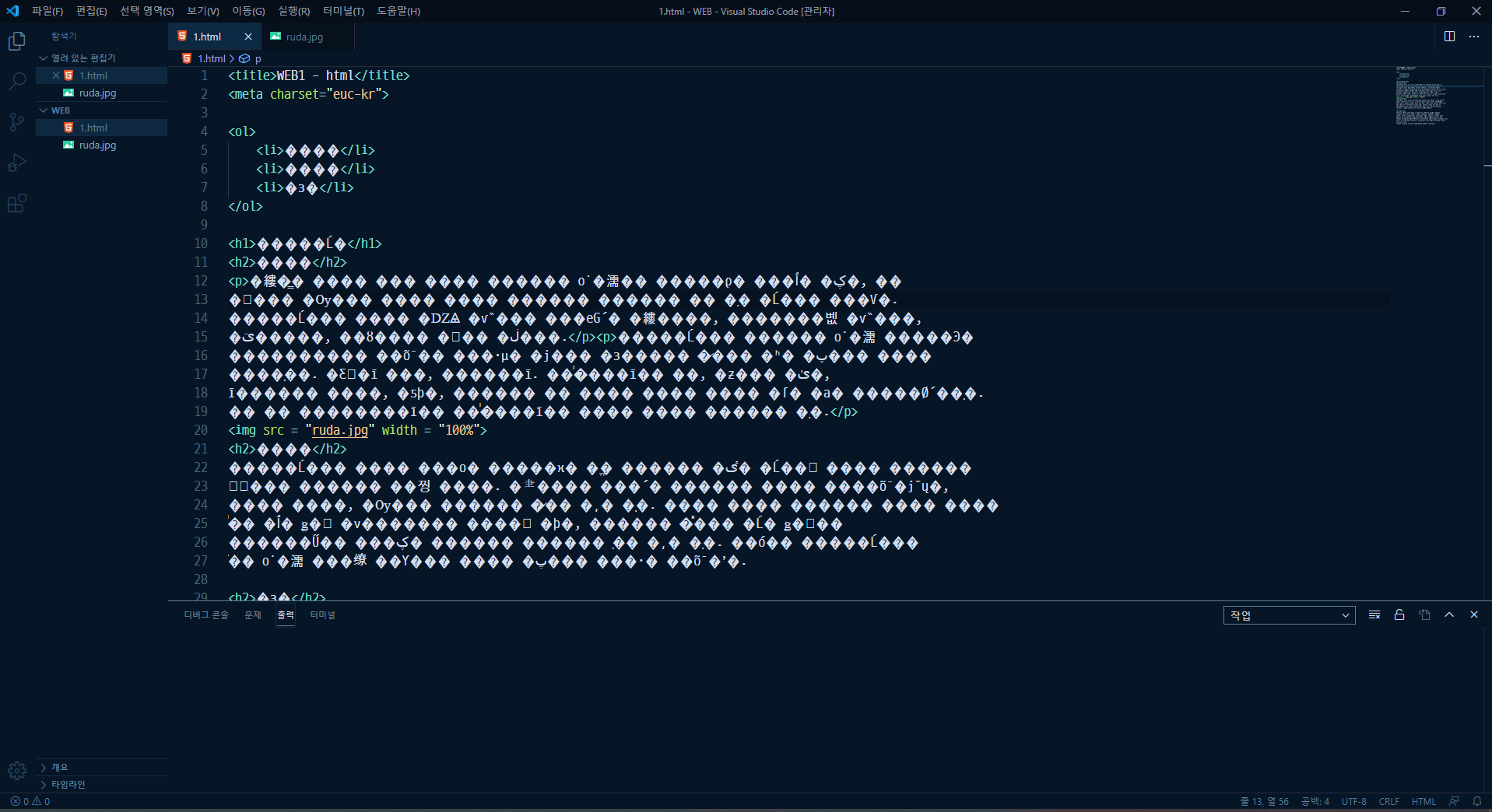 utf-8형식으로 인코딩했더니 도리어 글이 깨졌네요;;;; 무슨 일인가 싶어 제 vs code 창을 보니 제 html코드는 EUC-KR 형식으로 인코딩을 하고 있었습니다. 그래서 위의 meta tag를 euc-kr로 바꿔보았다.