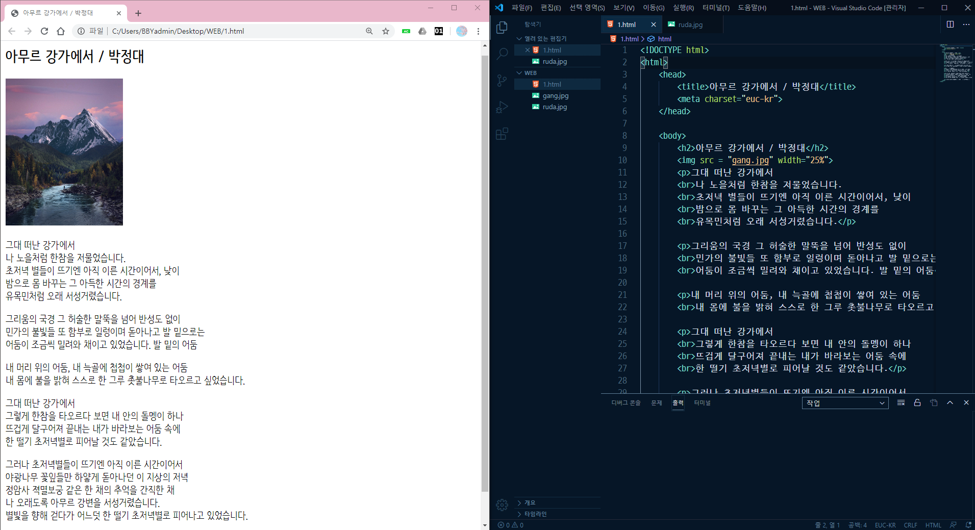 제 실력이 부족해 아직까진 vs code와 chrome에서 utf-8을 사용하긴 어려울 것 같아 default setting인 euc-kr로 사용하도록 하겠습니다. 앞에서 글자들이 전부 깨졌기 때문에 새로운 글(시)을 하나 가져와봤습니다. 아래의 시는 예전에 저를 위한 시로 추천받았던 시입니다. 한 번 감상해보시죠!