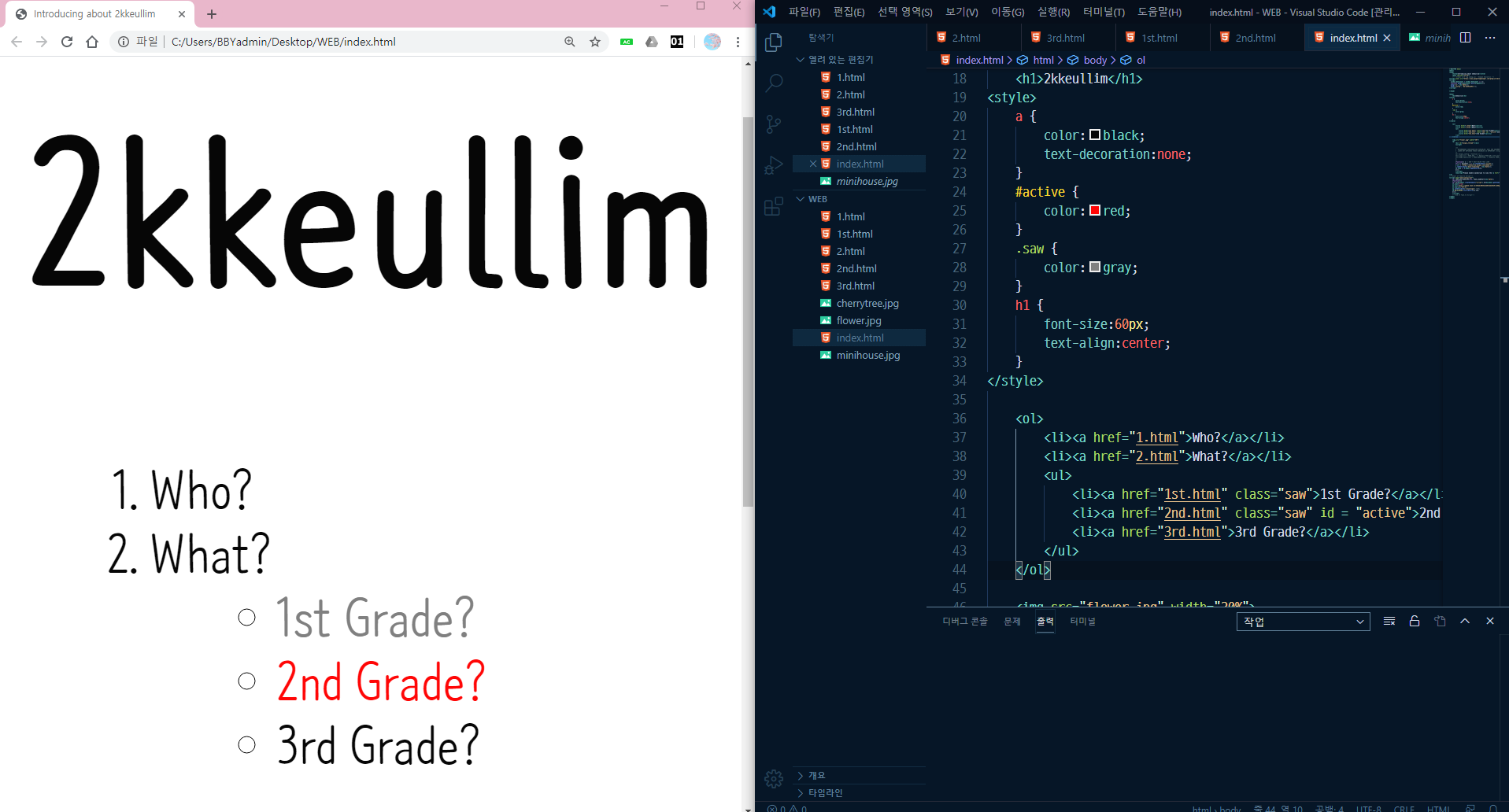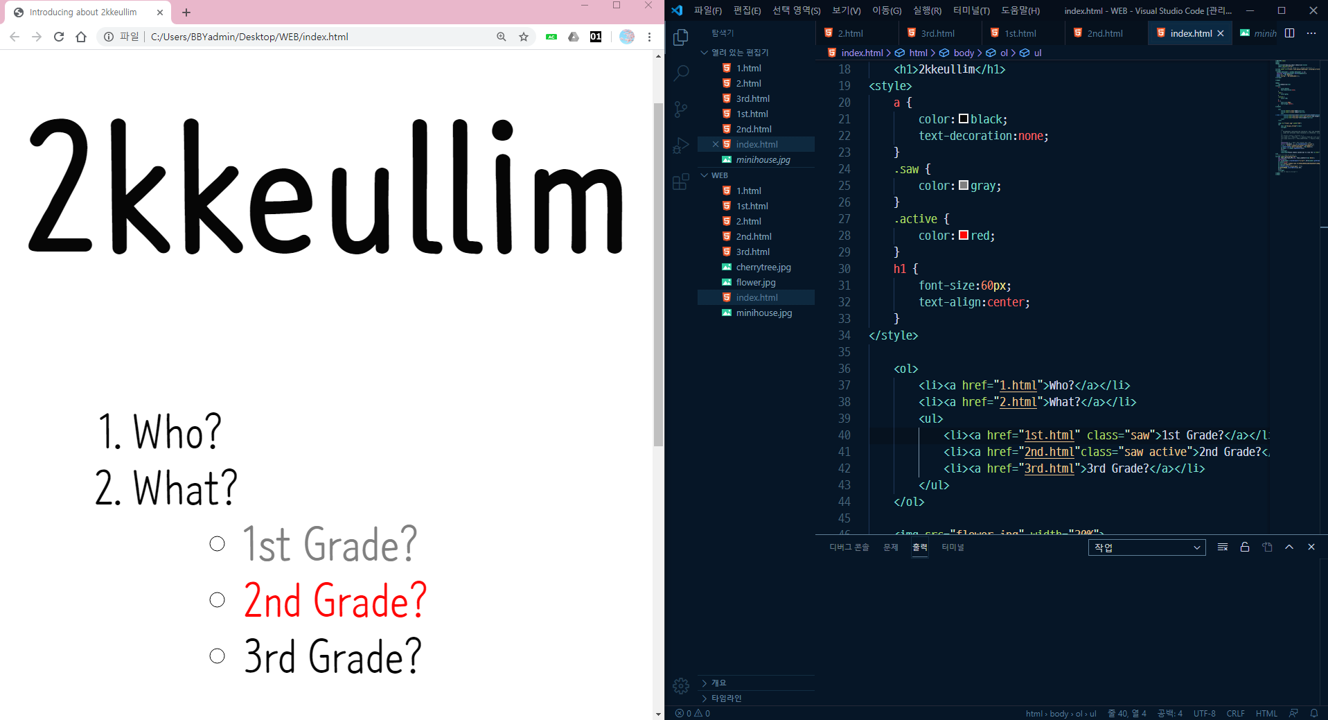 class의 값으로 saw를 준 "1st Grade?"와 "2nd Grade?"의 색이 회색으로 바뀐 모습을 볼 수 있습니다. class의 경우 한 번에 여러 속성이 들어올 수 있으며, 띄어쓰기로 구분됩니다. 또한 하나의 태그에는 여러 개의 속성이 들어올 수 있고, 여러 개의 선택자를 통해 하나의 태그를 공동으로 제어할 수 있습니다. 그럼 살짝 변형을 해보겠습니다.